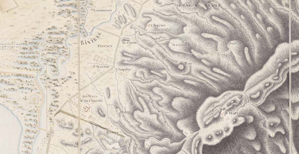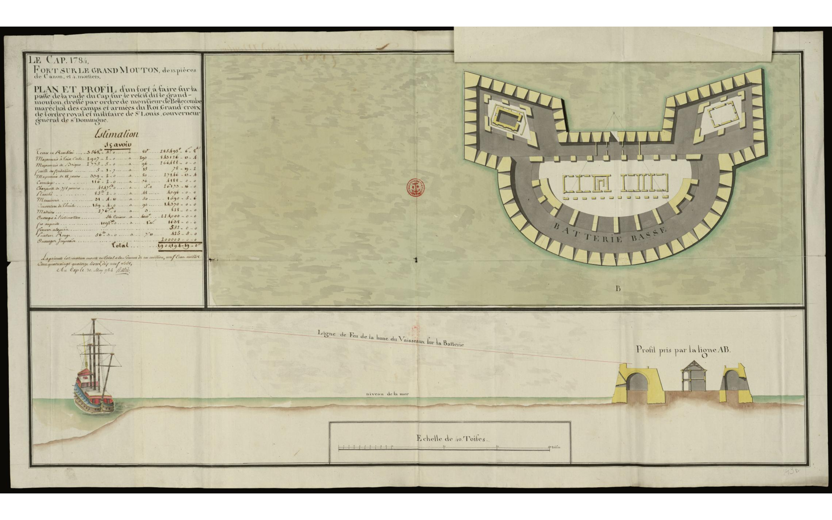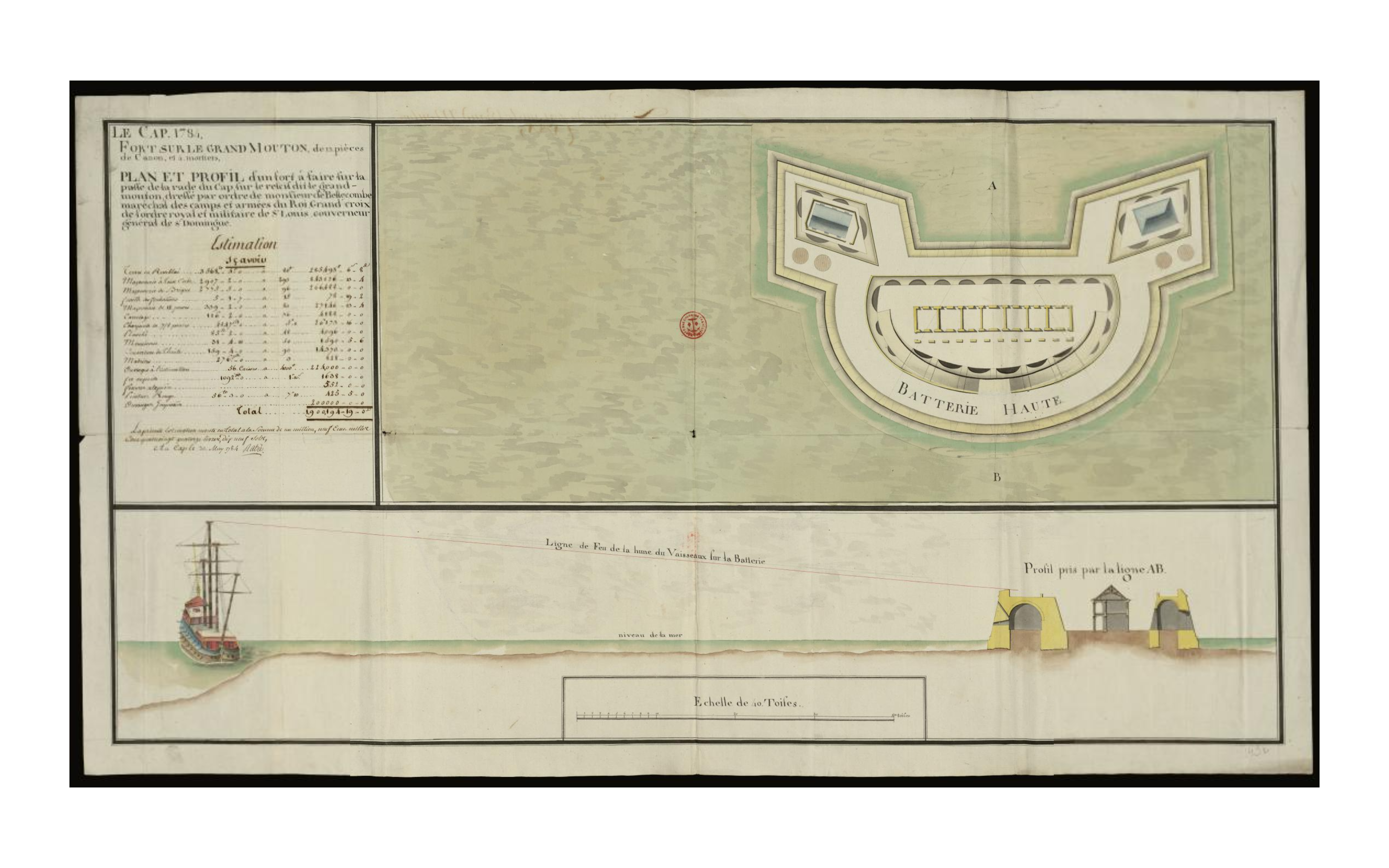 Un autre dessin, qui illustre un plan du chemin emprunté depuis la sortie du Cap jusqu’au sommet de la colline où des esclaves ont construit l’hôpital et les batteries, comprend deux rabats. Ces images révèlent les modifications qui pourraient être apportées au terrain pour faciliter le passage des colons et des soldats dans une région montagneuse qui leur est inconnue. L’État français a prêté des maçons en esclavage pour concrétiser ces projets civiques. Ces