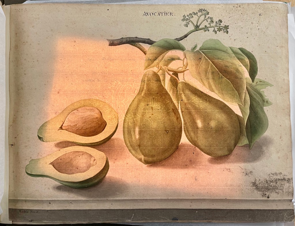 Other images in Fruits album are largely plants that were commonly eaten by either the enslaved, enslavers, or both groups. Long annotations accompany many of the entries in this section discussing the uses of such plants. These annotations were likely done by de Rabié’s daughter Jaquette Rabié de la Boissière, with the aid of her son, following her inheritance of the albums. Daughter and grandson discussed varied topics, from production techniques of cash-crops to which fruits colonial palates favoured, and to some enslaved peoples’ practices with plants.