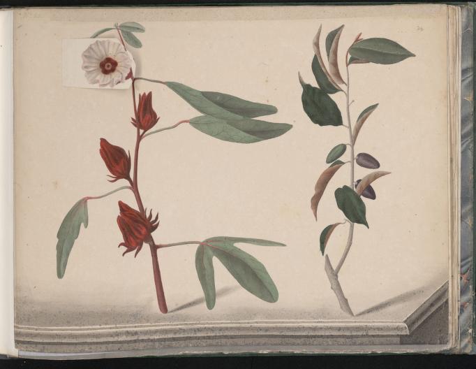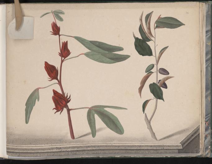 3 De Rabié’s décrit ainsi l’image, « Une branche d’oseille de Guinée avec sa feuille et son fruit, grandeur naturelle; et une branche de caïmitier sauvage. Grandeur naturelle, réalisée au Cap en 1770, Rabié. / n o 39. »
